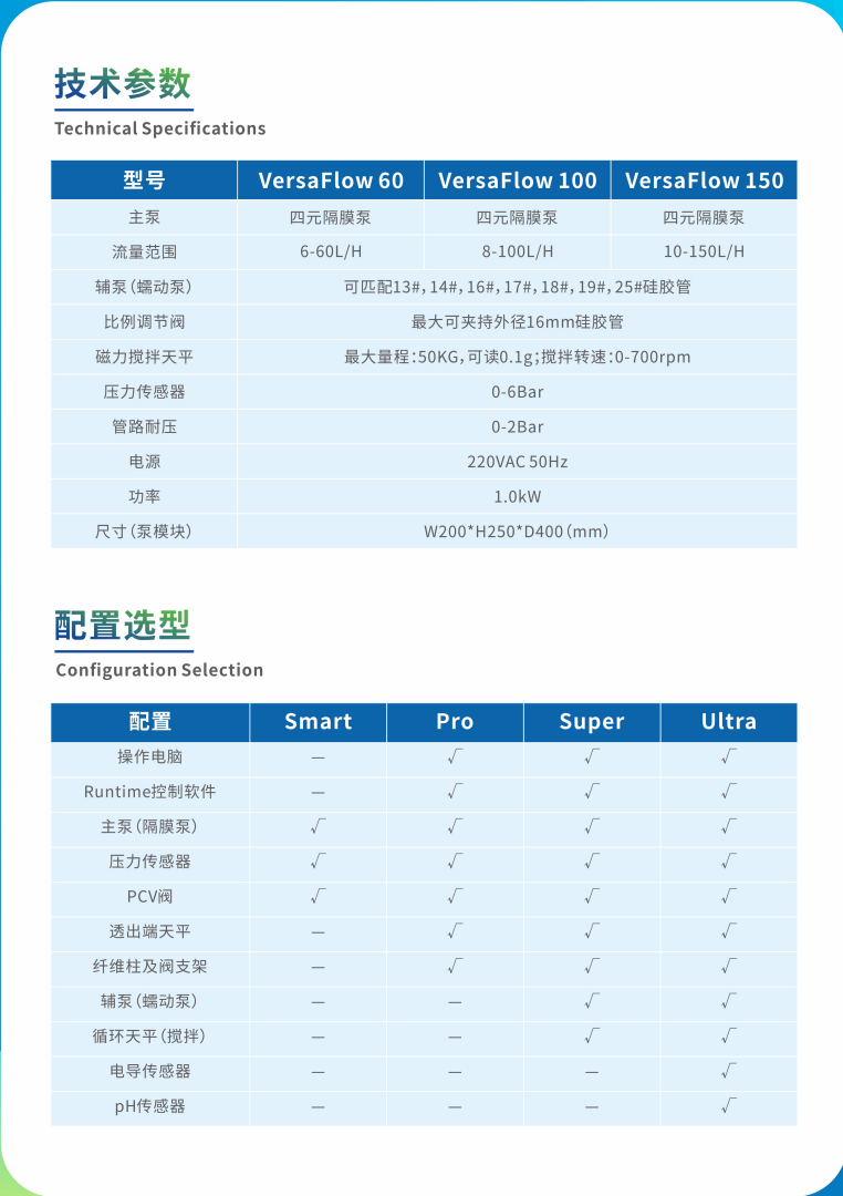 • 主泵或辅泵+压力->有转速、流量和恒压运行模式可进行深层过滤、除菌过滤、除病毒过滤等实验