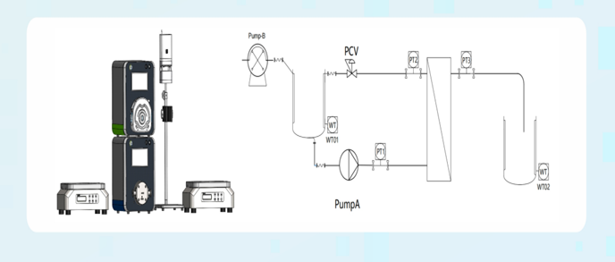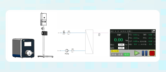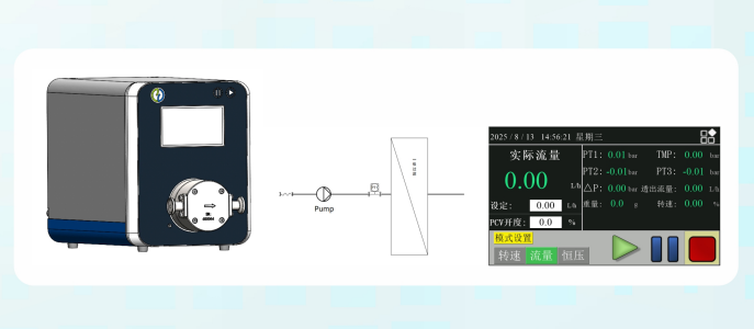 • 主泵+压力+PCV->有转速、流量、恒压TMP控制运行模式可进行除菌过滤、深层过滤、除病毒过滤、切向流过滤等实验