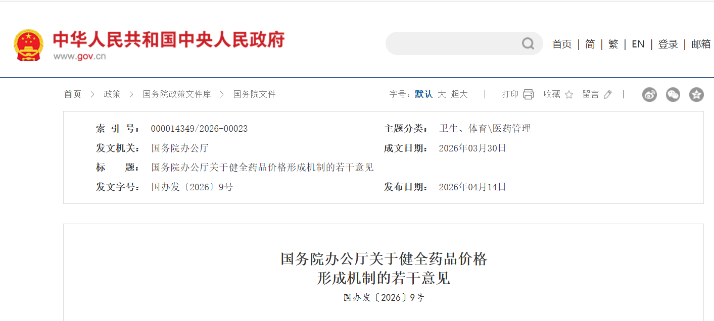 - 政策护航价值回归,创新药研发再迎春天 2026-04-22 国办发〔2026〕9 号文件《关于健全药品价格形成机制的若干意见》正式印发。文件立足创新药高投入、高风险、长周期、高回报的产业特征,构建市场主导、医保引导、多元支付、动态调整的药品价格新机制,为高水平创新药打通合理定价、真实世界研究调价、院外市场溢价的全周期发展通道。